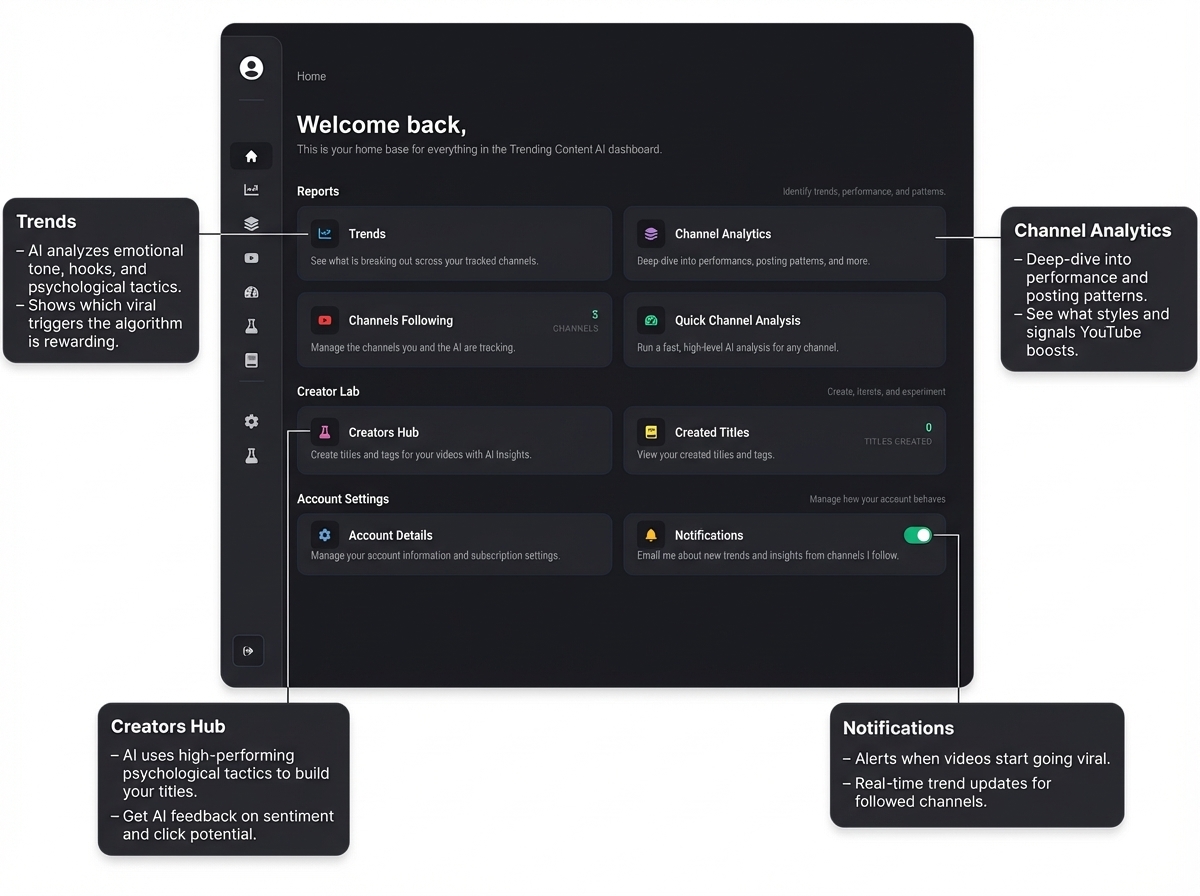Your all-in-one command center for discovering viral trends, analyzing channels, and creating high-performance titles powered by real-time AI insights.