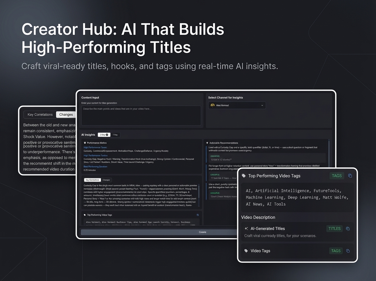The Creator Hub generates high-performing video titles using real-time YouTube trend analysis, emotional tone insights, and the psychological tactics that are driving clicks right now.